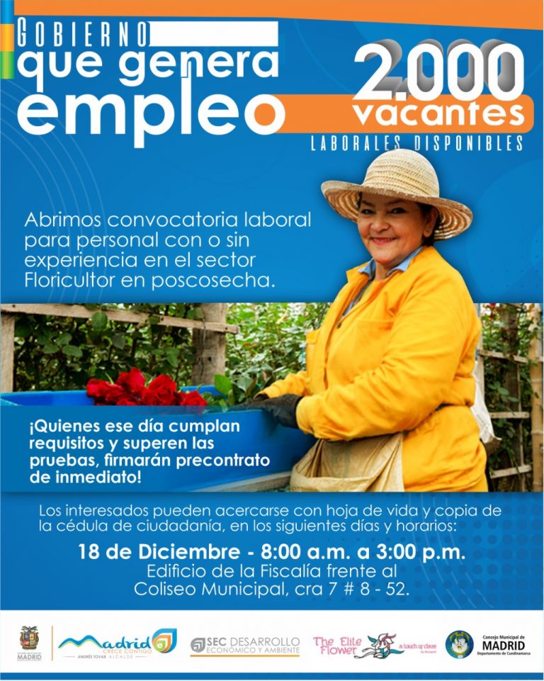 Con el fin de brindar oportunidades laborales para reducir la tasa de desempleo y mejorar la calidad de vida de los madrileños, la Administración Municipal de Madrid a través de la Secretaría de Desarrollo Económico y Ambiente en alianza con la Empresa Elite Flower abre convocatoria laboral para personal con o sin experiencia en el sector Floricultor en poscosecha.