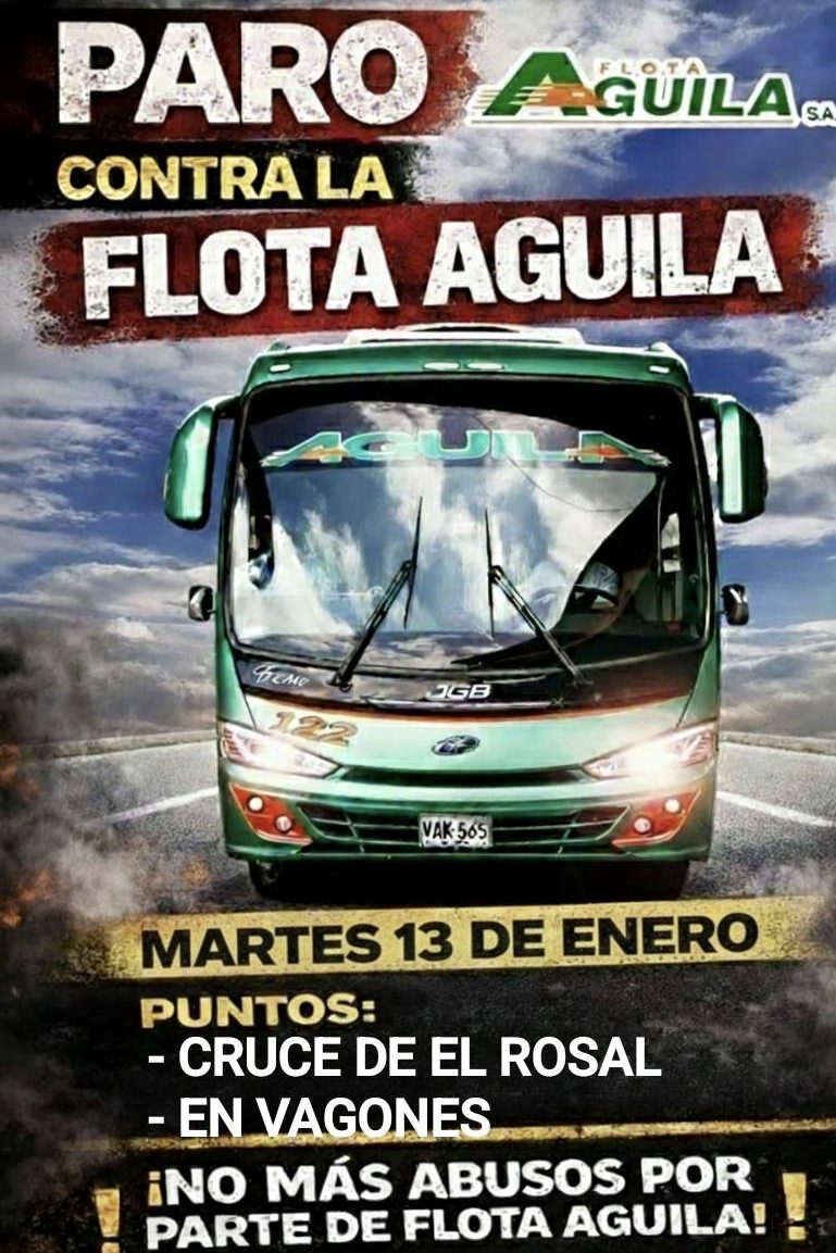 En paralelo a la publicación del tarifario, colectivos ciudadanos anunciaron una jornada de paro y protesta pacífica para este martes 13 de enero desde las 6:00 a. m., según los convocantes, en rechazo a incrementos aplicados en algunas rutas donde presta servicio la empresa Flota Águila, en distintas regiones.