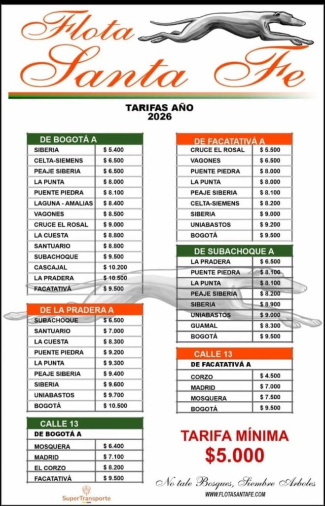 La empresa Flota Santa Fe publicó el tarifario vigente del transporte público intermunicipal para rutas que operan desde la calle 13 y la calle 80 de Bogotá, con destino a municipios de la Sabana Occidente y sectores aledaños.