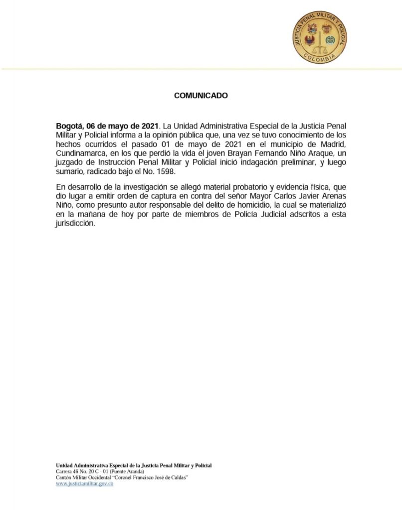 En la mañana de este jueves 6 de mayo, la Justicia Penal Militar (JPM) emitió un comunicado donde se confirmaba la captura del mayor Carlos Javier Arenas Niño, por su presunta responsabilidad en el homicidio del joven Brayan Fernando Niño Araque.