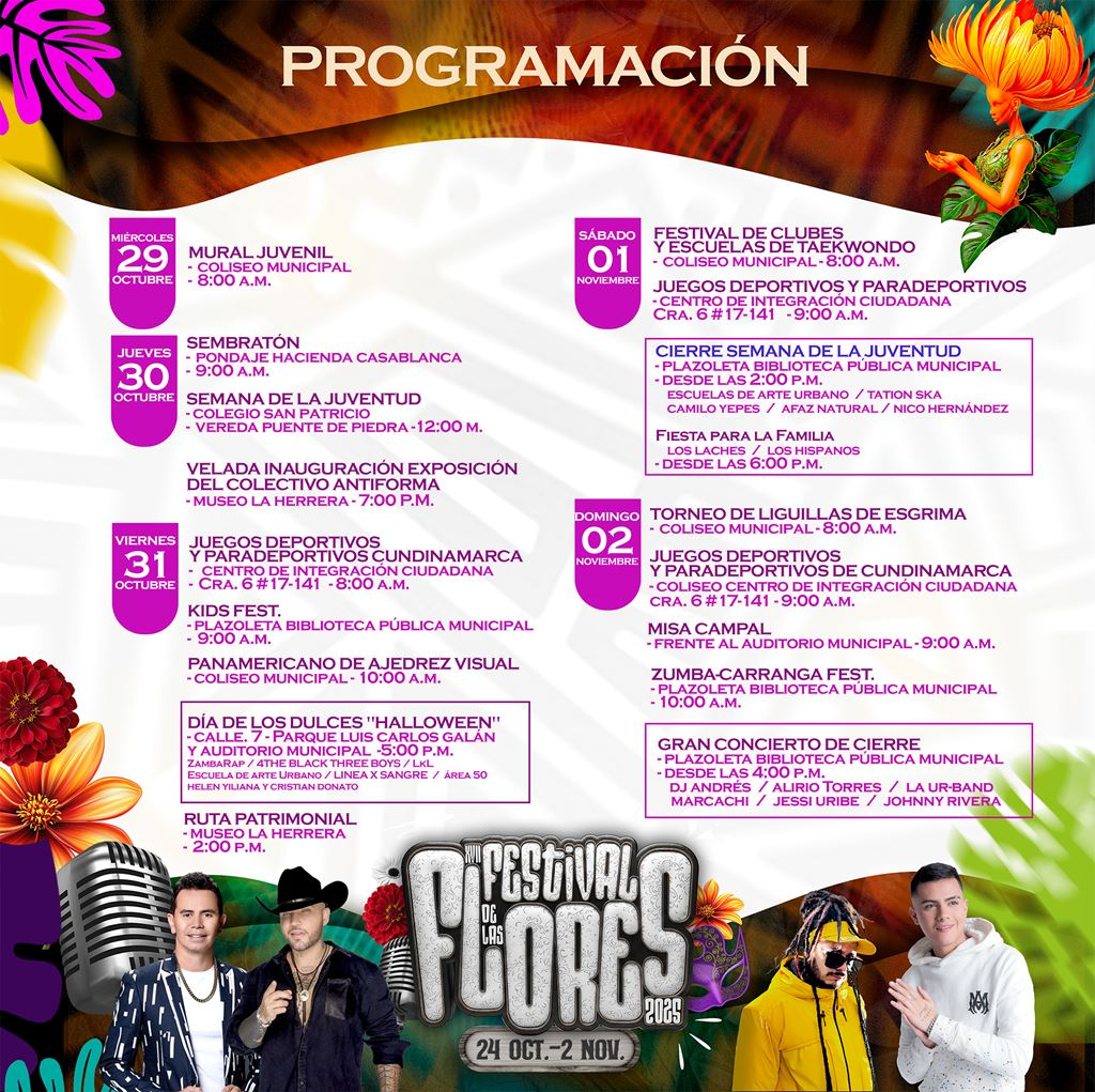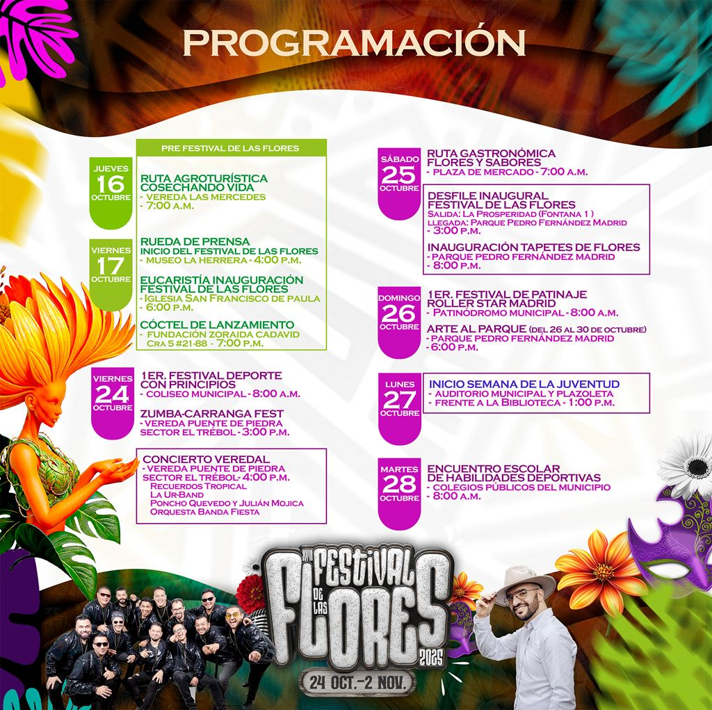 El municipio de Madrid, Cundinamarca, anunció la programación del Festival de las Flores 2025, que se llevará a cabo del 24 de octubre al 2 de noviembre. Durante varios días, los madrileños y visitantes disfrutarán de actividades culturales, deportivas y familiares en distintos escenarios del municipio.