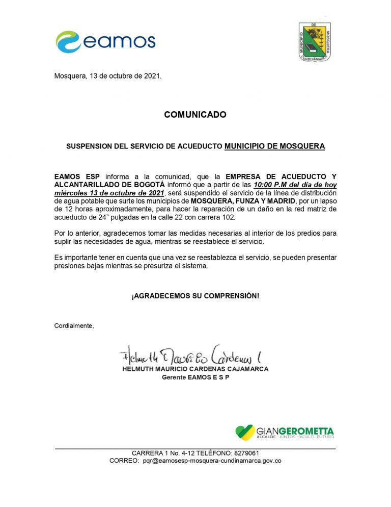 Desde las 10:00 p.m. del miércoles 13 de octubre se suspenderá el servicio de acueducto en los municipios de Madrid, Mosquera y Funza por trabajos de reparación de la red de distribución.